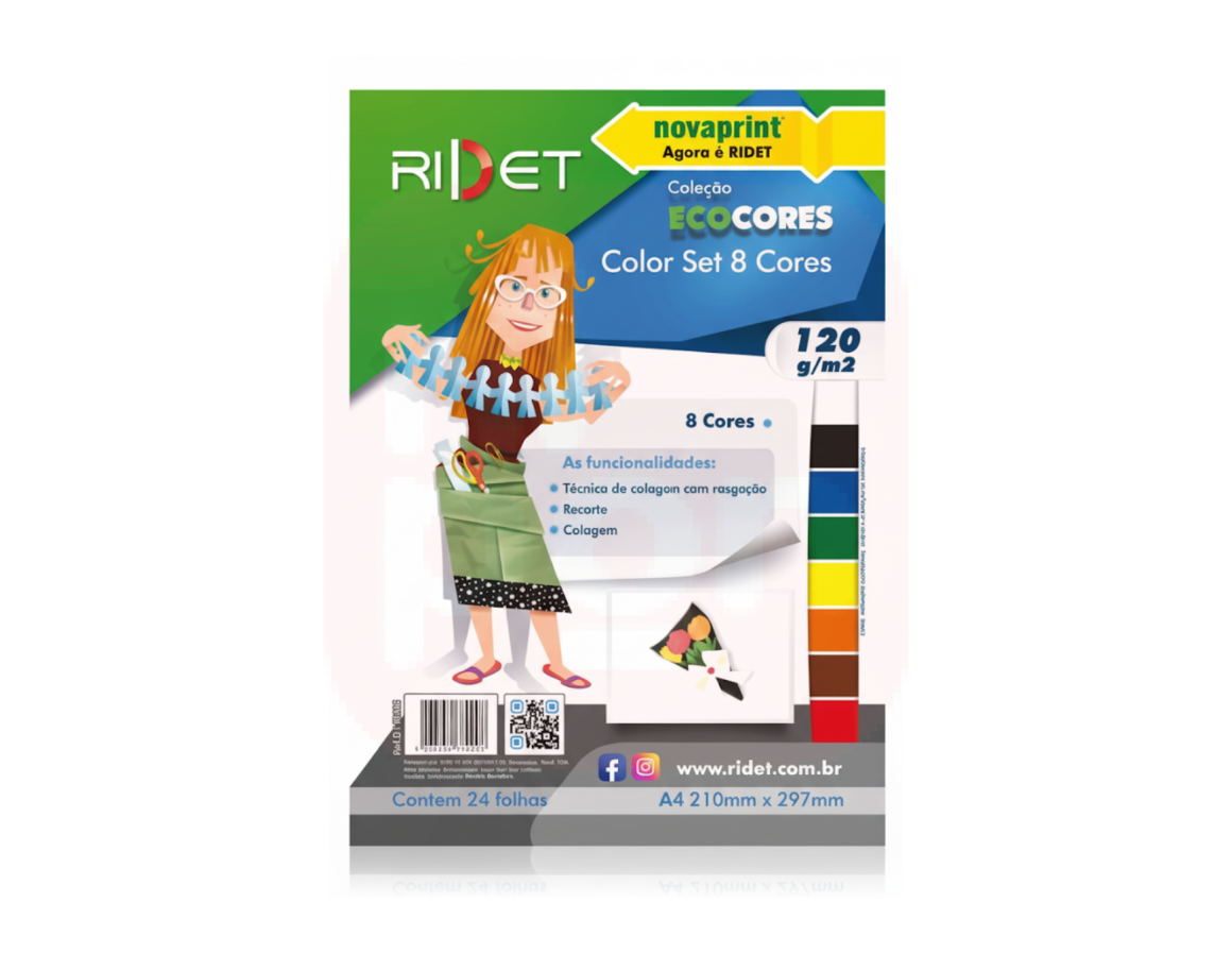 Destaque sua criatividade com o Bloco Ecocores A4 Color Set 120g da Ridet! Composto por 24 folhas em 8 cores vivas e sortidas, este bloco é perfeito para atividades escolares, artesanato, scrapbooking, colagens, painéis e projetos criativos em geral.